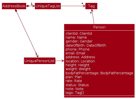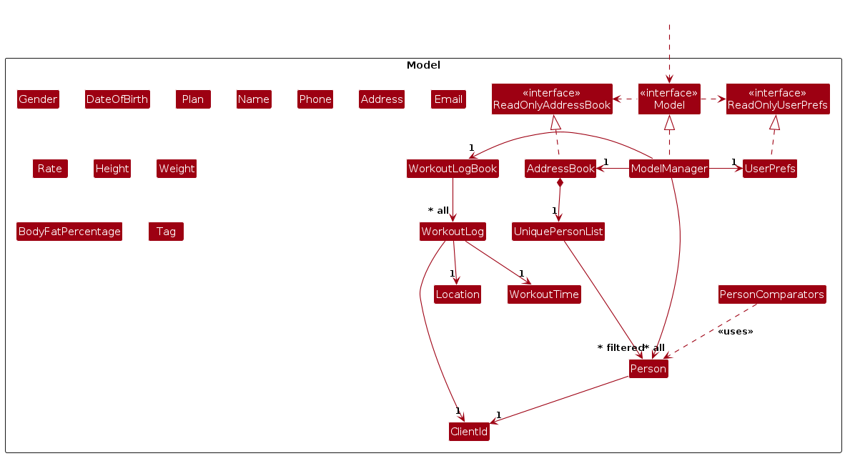 Person objects (which are contained in a UniquePersonList object).Person objects (e.g., results of a search query) as a separate filtered list which is exposed to outsiders as an unmodifiable ObservableList<Person> that can be 'observed' e.g. the UI can be bound to this list so that the UI automatically updates when the data in the list change.UserPref object that represents the user’s preferences. This is exposed to the outside as a ReadOnlyUserPref objects.ArrayList of WorkoutLog objectsModel represents data entities of the domain, they should make sense on their own without depending on other components)Note: An alternative (arguably, a more OOP) model is given below. It has a Tag list in the AddressBook, which Person references. This allows AddressBook to only require one Tag object per unique tag, instead of each Person needing their own Tag objects.