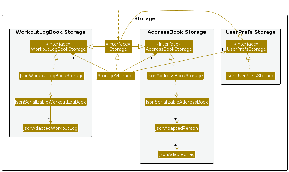 AddressBookStorage, WorkoutLogBookStorage, and UserPrefStorage, which means it can be treated as any one (if only the functionality of only one is needed).Model component (because the Storage component's job is to save/retrieve objects that belong to the Model)Classes used by multiple components are in the seedu.address.commons package.