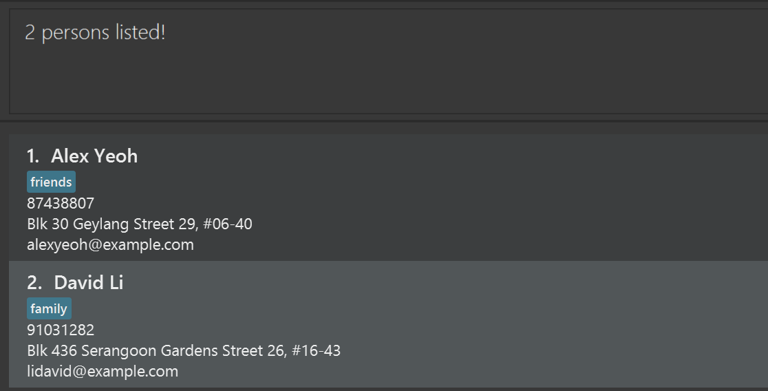 | Edit | edit INDEX [n/NAME] [g/GENDER] [dob/DATE_OF_BIRTH] [p/PHONE] [e/EMAIL] [a/ADDRESS] [l/LOCATION] [t/TAG]…e.g., edit 2 n/James Lee e/jameslee@example.com |